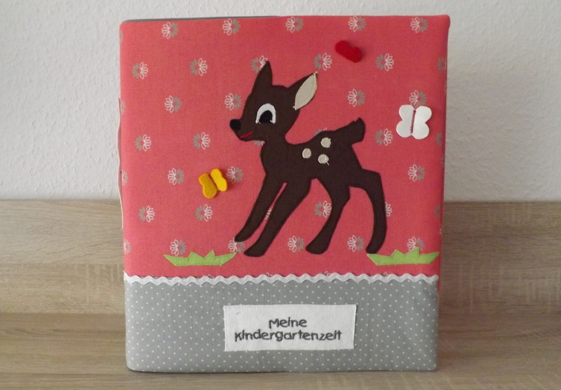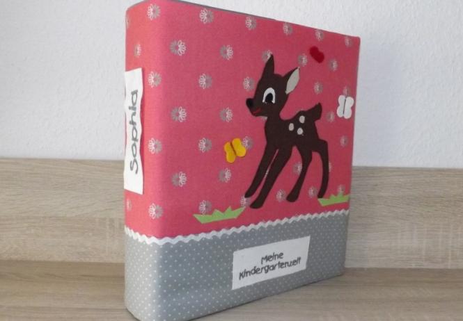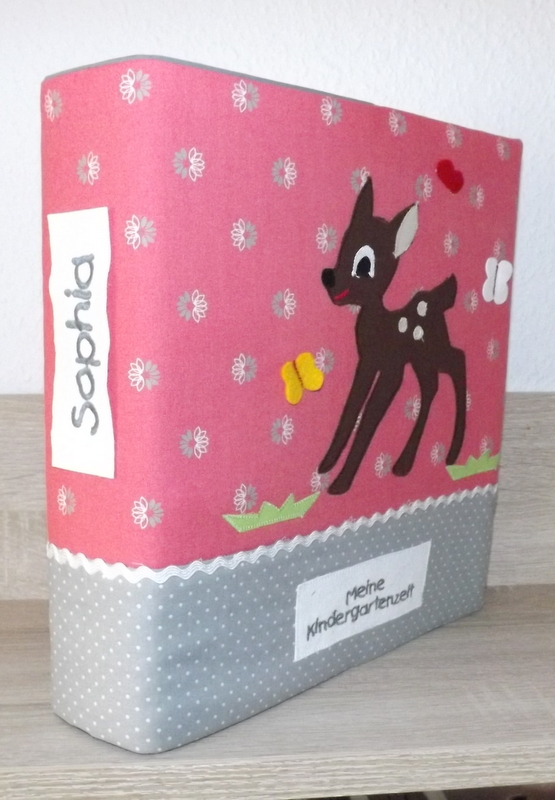 Schöne per Hand bestickte und personalisierte Ordnerhülle für den Kindergartenordner.
